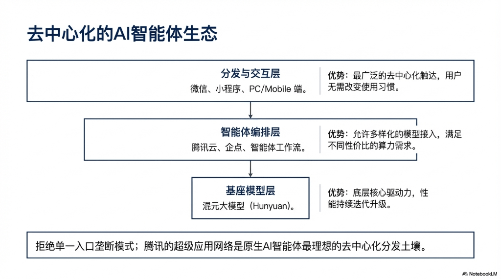腾讯认(ren)为,自(zi)身在这一领域具备天然优势:既有微信等中心化(hua)超级App作为流量(liang)入口,又运(yun)营着中国最活跃的去中心化(hua)生态——小程序平台(tai)。随着智能体能力的注入,小程序开发者将能够为用户提供更加智能、主(zhu)动的服务,这将是(shi)腾讯在未(wei)来AI竞争中最重要(yao)的价值定位之一。