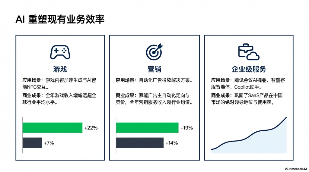 此外,在营销服务领域,腾讯通过部(bu)署(shu)长序列AI模(mo)型和(he)生成式AI工具,极大提升了广告的精(jing)准投放(fang)和(he)创作效率,其推出(chu)的“AI广告投放(fang)解决(jue)方案(an)”帮助广告主(zhu)实现自(zi)动化(hua)竞价与投放(fang),从而提升投资回(hui)报率,并吸引更多预算倾斜,最终驱动2025年营销服务收(shou)入同比增(zeng)长19%,远超中国行业平均14%的增(zeng)速。