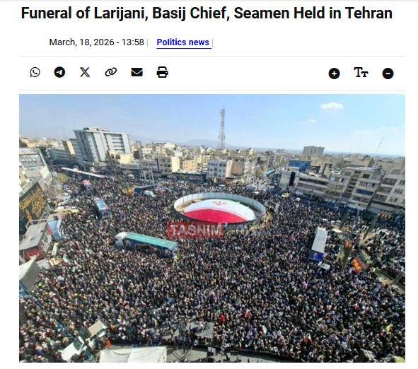 中新(xin)网3月18日电 据伊朗塔斯尼姆通信社(she)报导,当地时间18日,伊朗最高国家安全委员会秘书阿里·拉里贾尼、巴斯基(ji)民兵组织指(zhi)挥官苏莱曼(man)尼的葬礼以及数十名海武士员的葬礼正在德(de)黑(hei)兰进行。