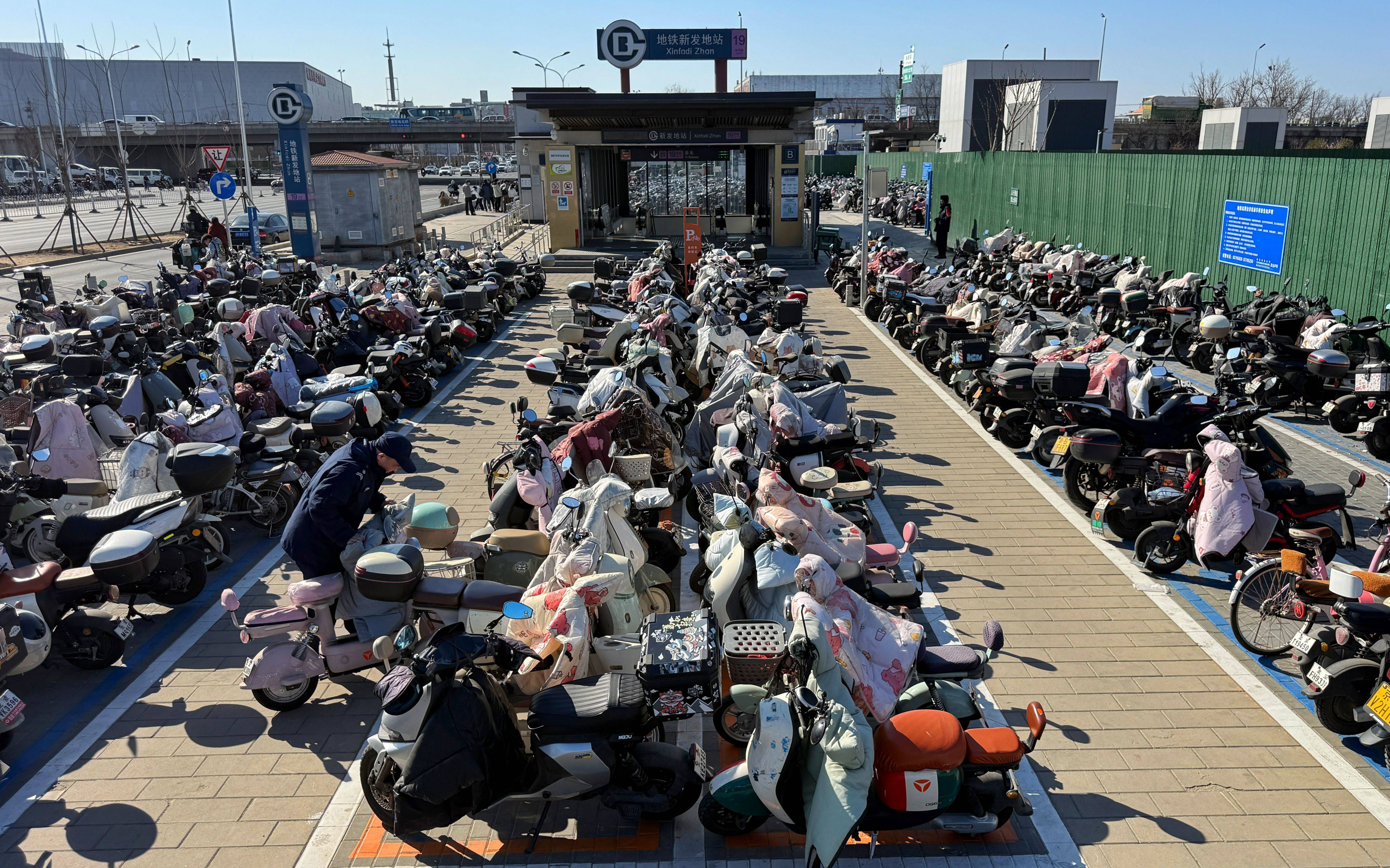 3月18日,地铁(tie)新(xin)发地站B口外,工作人员码放电(dian)动自(zi)行车。新(xin)京报记者 王(wang)贵彬 摄