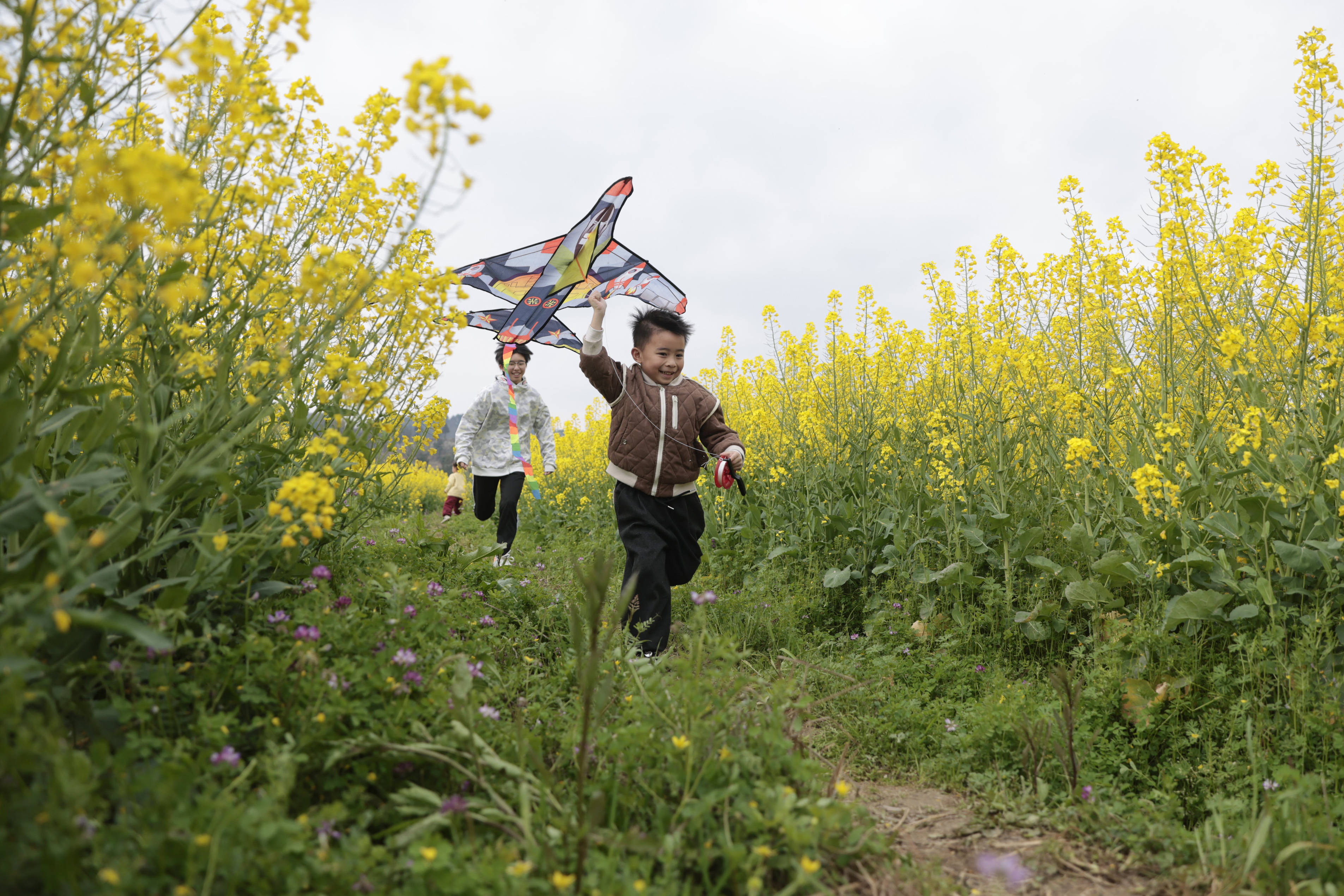 3月14日,小朋友在贵州(zhou)省黔东南(nan)苗(miao)族侗族自治州(zhou)一处油菜花田中放(fang)风筝。新华社发(磨桂宾摄)