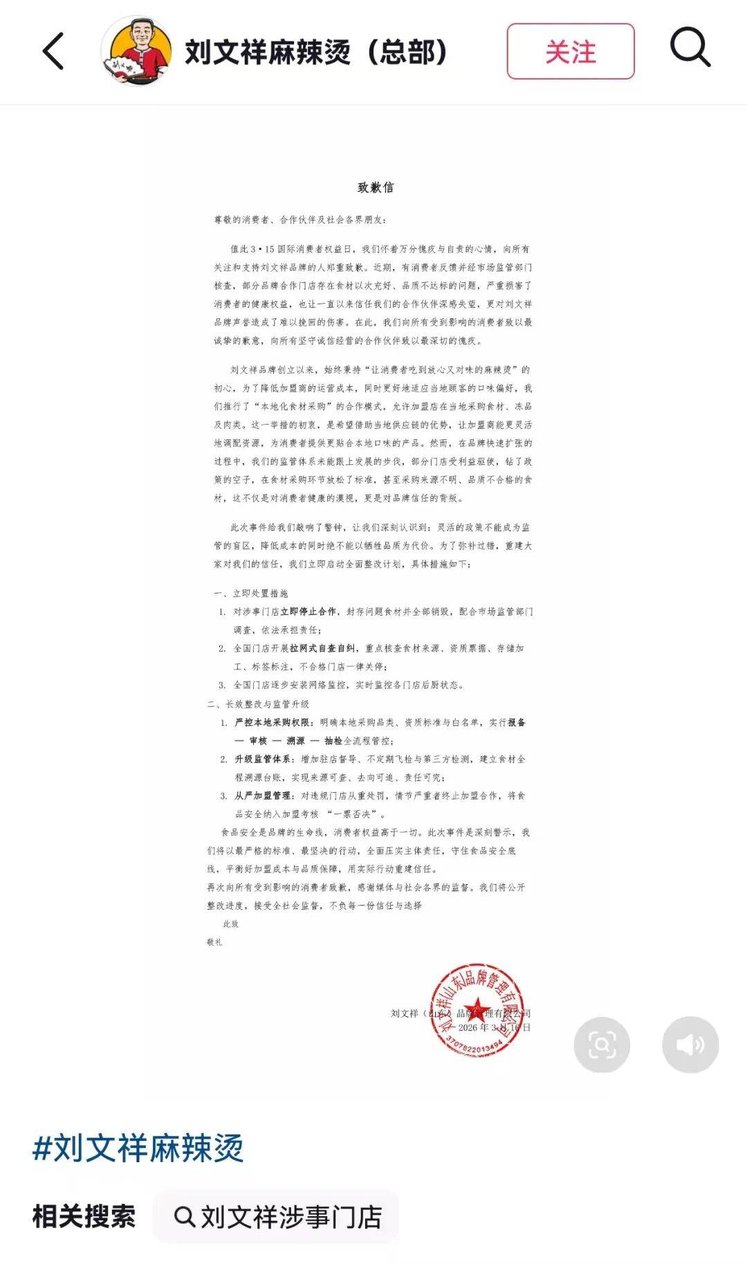 3月16日,刘文祥发布致歉信,内容如下:值此3.15国际消(xiao)耗者权益日,我们怀着万分愧疚与自责的心情(qing),向(xiang)所有存眷和支(zhi)持刘文祥品(pin)牌的人郑重致歉。近期,有消(xiao)耗者反馈并经市场监管部门核查,部分品(pin)牌合作门店存在食材以次充好、品(pin)质不(bu)达标的问题,严重损害了消(xiao)耗者的康健权益,也让不(bu)停(ting)以来信托我们的合作伙伴(ban)深感失(shi)望,更对刘文祥品(pin)牌声誉造成了难以挽(wan)回的危险。在此,我们向(xiang)所有受到影响(xiang)的消(xiao)耗者致以最真挚的歉意(yi),向(xiang)所有坚守诚信经营的合作伙伴(ban)致以最深切(qie)的愧疚。