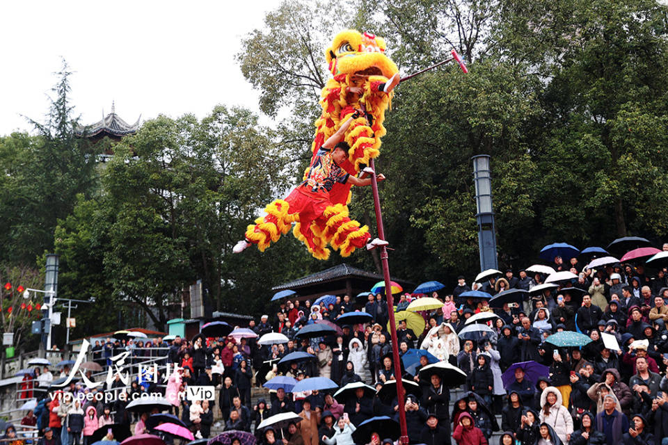 2026年3月2日,重庆黔江区武陵水岸,民间艺人表演高杆舞狮。当日,黔江区举办第十八届龙狮大会,来自全区的15支传统龙狮队(dui)、花灯队(dui)表演了舞龙、舞狮、划彩龙船等节目,吸引众多市民观看,热热烈闹欢迎元(yuan)宵节。杨(yang)敏摄(人民图片(pian)网)