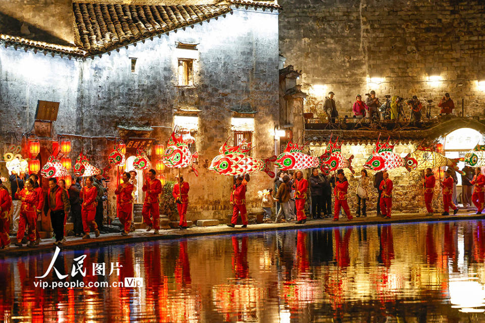 2026年3月2日,安徽黄山黟(yi)县宏村举办“花灯映(ying)画里”巡游流动。巡游队(dui)伍穿(chuan)行于古村,吸引了众多旅客前(qian)来鉴赏,共迎元(yuan)宵佳节。施亚磊摄(人民图片(pian)网)